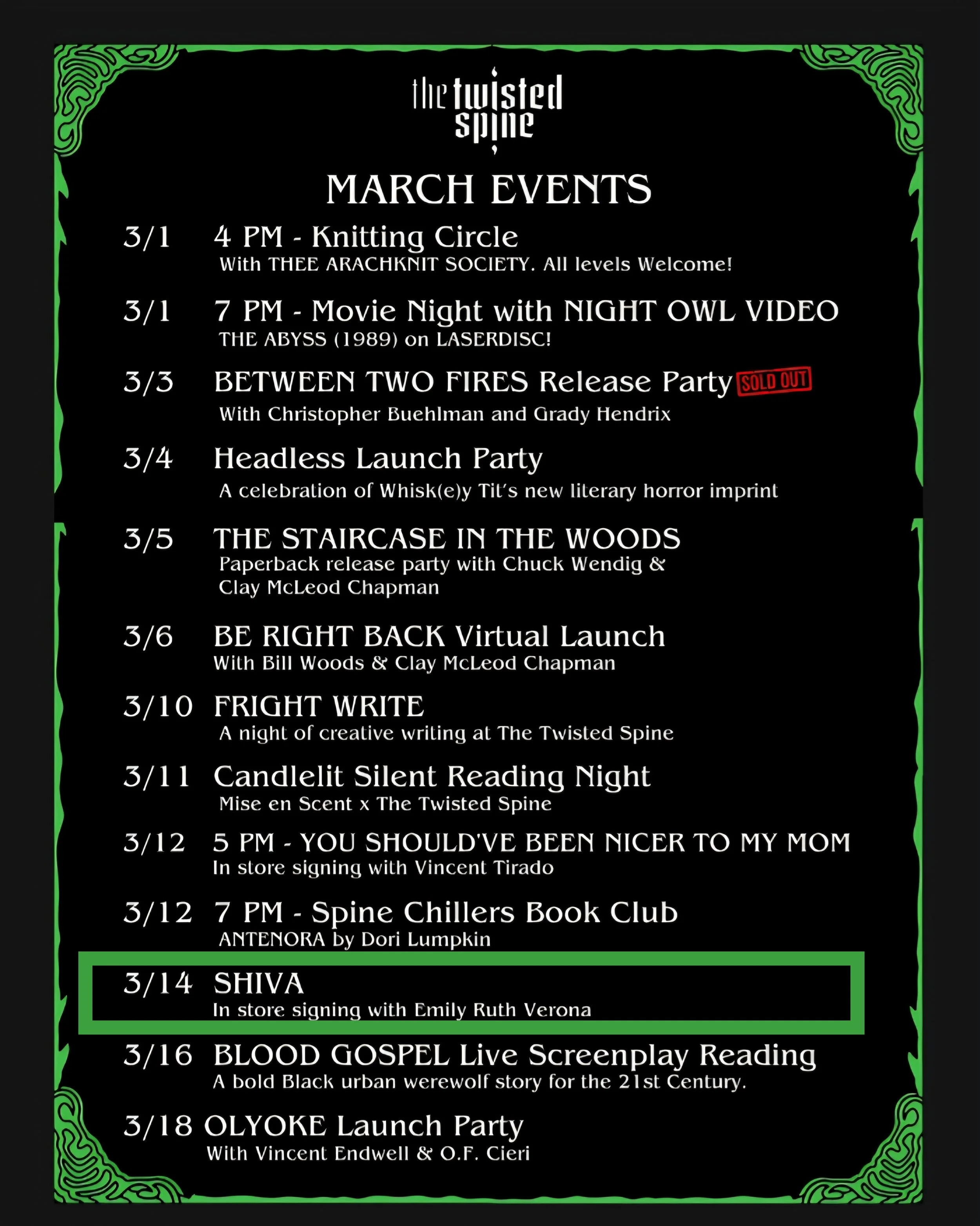 Emily will be at The Twisted Spine in Brooklyn, New York from 3pm-5pm to chat with readers and sign copies of her new novella, Shiva.